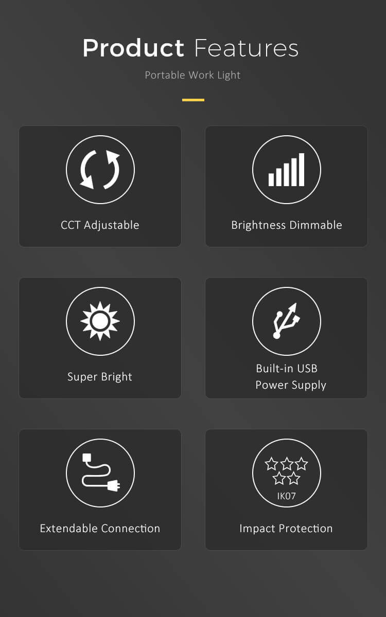 This portable LED work light comes with 60W 6000lm, features CCT adjustable and brightness dimmable. The reserved slot enables you to sort cables without occupying much space. Thanks to the AC socket & USB socket on the heatsink’s backside, it provides an extendable connection for more devices no matter AC or DC powered. The brackets are easy to be folded or unfolded to get a needed angle. Customers can fix the work light to any wanted place through the extension hole on brackets